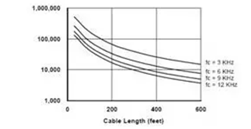 變頻器的載波頻率越高,輸出電流波形越接近正弦波,這會降低電機(jī)的運行溫度,從而延長絕緣的壽命。但是,更高的載波頻率意味著每秒鐘產(chǎn)生的尖峰電壓數(shù)量更多,對電機(jī)的沖擊的次數(shù)更多。圖4給出了絕緣壽命隨著電纜長度與載波頻率的變化。從圖中可知,對于200英尺長的電纜,當(dāng)載波頻率從3kHz提高到12kHz(變化4倍)時,絕緣的壽命從大約8萬小時降低到2萬小時(相差4倍)。